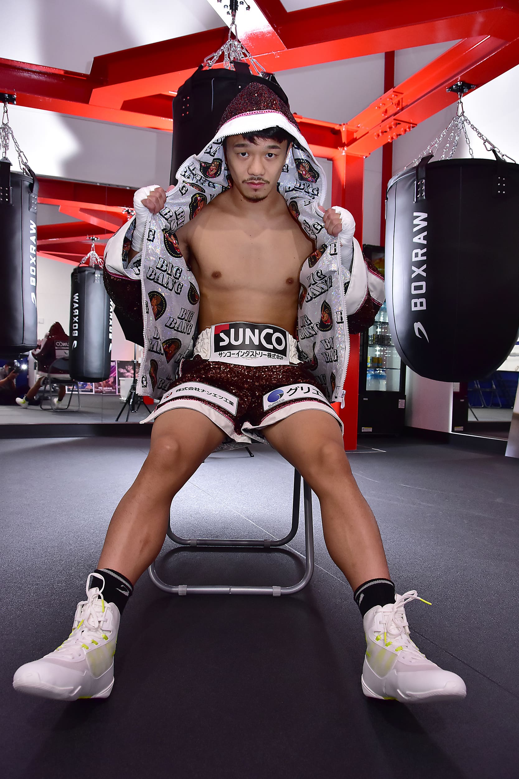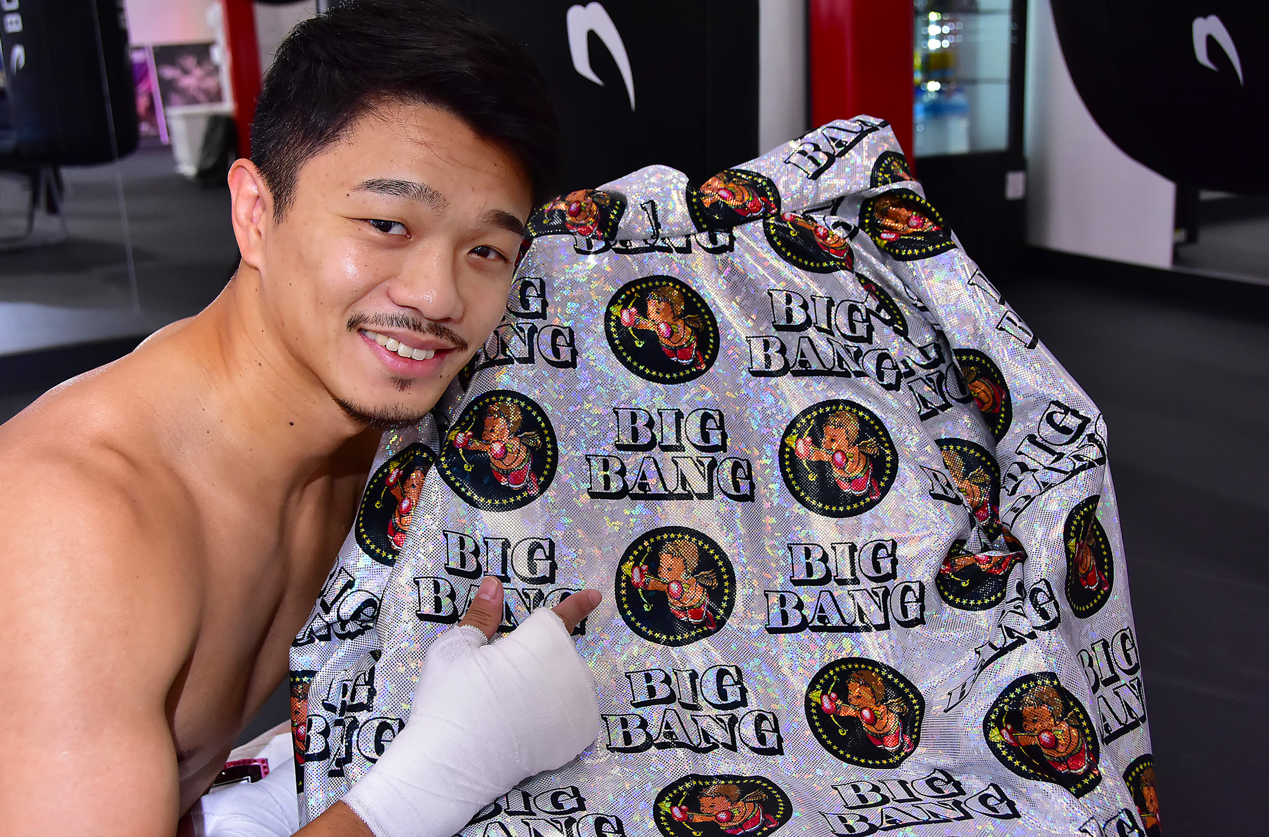 こだわりが詰まったプライベートジムの前で。「BIGBANG」は文字通り爆発的な強打で24人の世界ランカーを葬って来た中谷の愛称だ