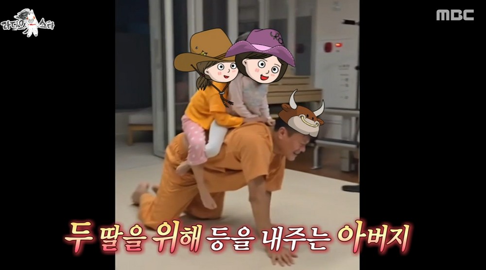 이어 그는 “요즘 아이들이 빠진 건 ‘로데오 놀이’다. 두 딸을 등에 태우고 제가 소처럼 엎드려서 몸부림을 쳐도 안 떨어지지 않아야 하는 게임이다. 떨어뜨리기 위해서 노력도 해야 하는데 진짜 떨어지면 화내니까 떨어뜨리려는 척만 해야 한다. 밖에선 인기 가수 대접을 받지만 집에선 무릎 꿇고 엎드려서 딸들 태우고 놀아준다”라며 육아의 현실을 솔직하게 고백했다. 김구라는 “직접 몸으로 놀아주는거 쉽지 않다”라며 놀라움을 감추지 못했다.