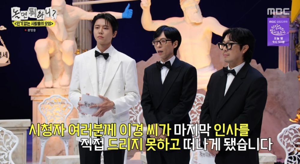 이어 “지난주 방송이 갑작스럽게 결방이 되고 날짜가 픽스되면서 시청자 여러분들에게 마지막 인사를 드리지 못하고 떠나게 된 점 양해 부탁드린다”라고 당부하곤 “앞으로 이이경의 왕성한 활동을 응원하겠다”라며 이이경을 격려했다.