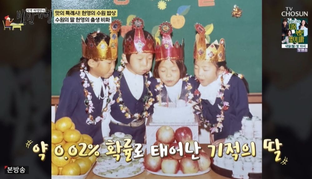 이날 수원 출신 현영은 “수원의 딸이다”라고 소개했다. 현영은 “그땐 ‘둘만 낳아 잘 살자’는 운동을 할 때였다. 그래서 아버지가 이제 그만 낳아야 되겠다 해서 수술을 하셨는데, 그게 풀려서 제가 생겼다. 어머니, 아버지가 대판 싸우셨다”라며 0.02% 확률로 태어났다고 고백했다.