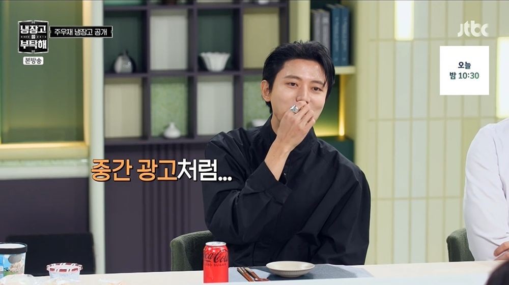 주우재는 “그러실까봐 밑에 준비했다”라고 말하며 안심시켰지만, 냉동칸엔 아이스크림과 계란빵 등이 들어 있었다. 주우재는 “여러 재료를 추출해서 쓸 수 있다”라며 빵, 계란, 베이컨이 있다고 강조했고, 초코 빙수를 보여주며 “귤, 밤 보이냐. 귤 하나는 선착순”라고 말해 웃음을 자아냈다.