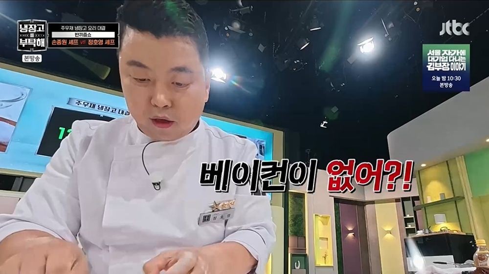 이어 실온 재료가 공개됐다. 주우재는 “쇼 타임”이라고 외쳤지만, 라면과 과자뿐이라 셰프들은 실망했다. 밀키트 등장에 셰프들은 “저것밖에 없다”라고 눈에 불을 켰고, 주우재는 “처음으로 흥미를 가지시네요?”라고 말했다. 이미 대결을 끝낸 김풍은 “해야지. 그게 ‘냉부’지. 내가 이걸 맡아야 했는데”라고 아쉬워하는 척했다.