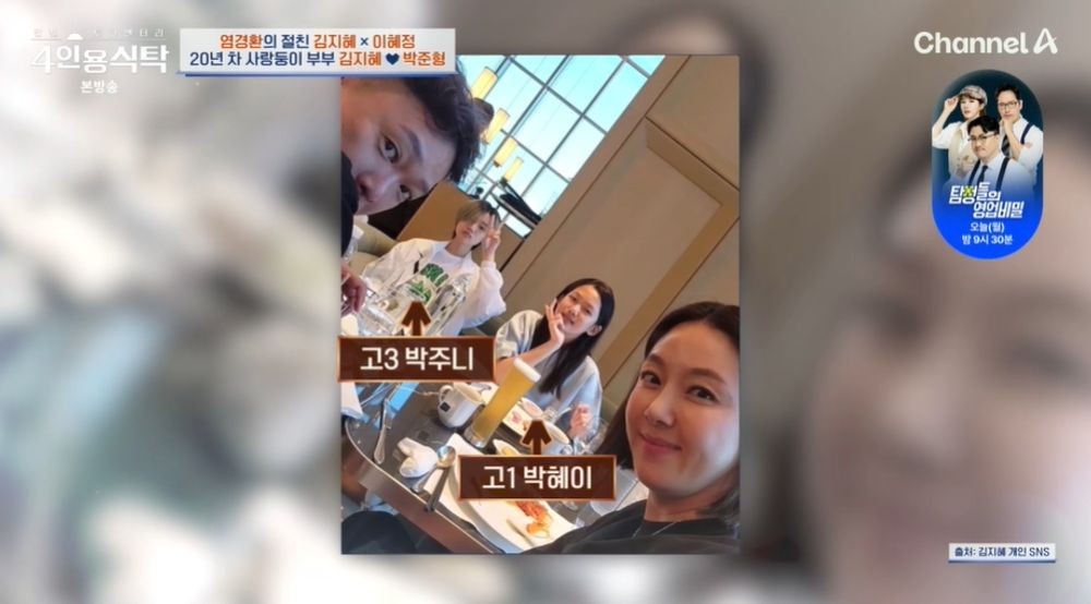 고3, 고1 두 딸을 둔 김지혜는 “외모적인 건 남편 DNA가 독하다. 아이들이 확실히 재치가 있다. 가족 화보를 찍을 때 메이크업을 시켜주니까 거울을 보더니 ‘예쁜 갈갈이인데?’라고 한다”라며 “둘이서 서로 아빠 닮았다고 디스한다”라고 말해 웃음을 안겼다. 김지혜는 “첫째는 실용음악과 입시 준비를 하고 있고, 둘째는 선화예고에서 미술을 한다”라며 “둘 다 방송에 관심이 많다”라고 덧붙였다.