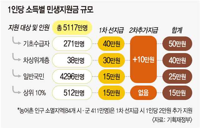 전 국민 중 소득·생활 취약계층 중심으로 1인당 20만 원씩 추가 지급된다는 점입니다.