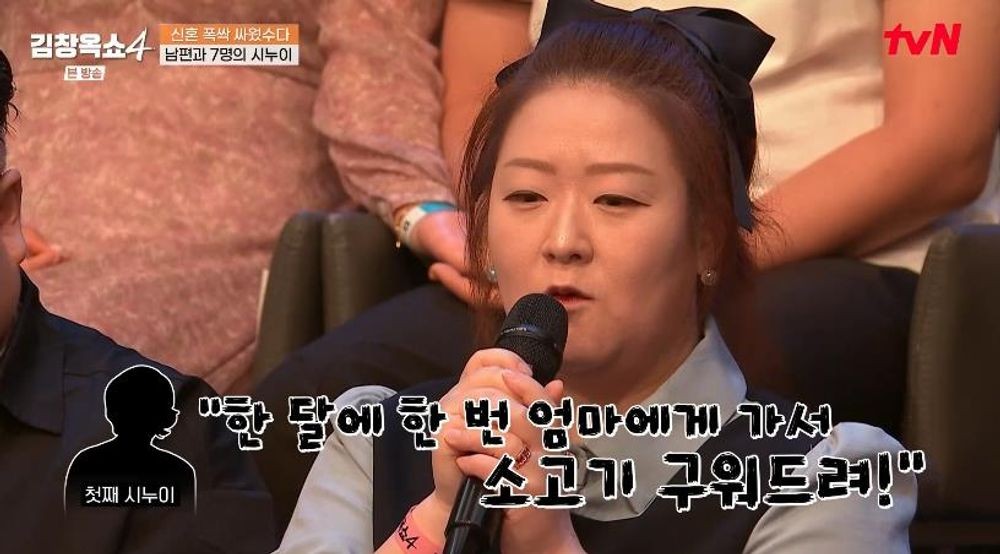 이날 남편 때문에 속앓이 중인 신혼 10개월 차 아내의 사연이 공개됐다. 아내는 “저에게는 시누이가 7명이가 있다. 제 남편은 7녀 1남 중 막내다”라고 밝혀 관객석을 술렁이게 했다.