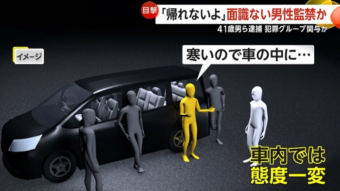 竹原大輔容疑者(41)ら4人が監禁の疑いで逮捕された。竹原容疑者とウズベキスタン人の男3人は、面識のない男性を車に監禁した疑いが持たれている。