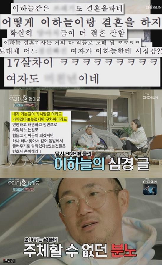 이에 박유선은 “오빠(이하늘)한테도 말하기가 너무 어려워서 이혼하고 얘기한 것 같다”며 “결혼식 한 달 반 전 결혼 기사에 악플이 너무 많이 달렸다”고 말했습니다.