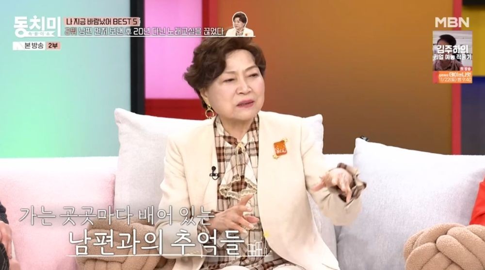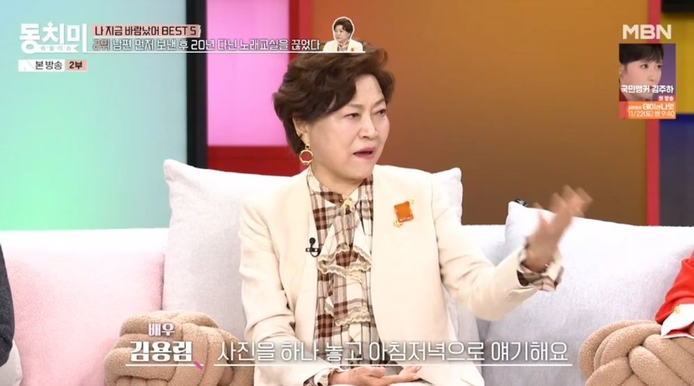 이어 김용림은 “코로나19가 발병하면서 노래교실을 못 가게 됐고, 남편이 아프기 시작했다. 남편이 가고 났는데, 바로 노래하러 가기가 (힘들었다)”라며 “내 마음을 위로하고 싶어서 노래하고, 친구들을 보러 가고 싶었다. 그런데 내 마음에 49재도 지나야 할 것 같고, 49재가 지나니 3년은 지나야 할 것 같았다. (남편이) 가고 나니까 많이 생각나더라”라면서 노래 교실을 가지 못한 이유를 말했다.