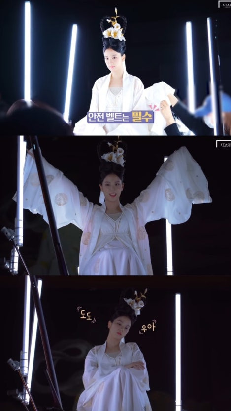 곧이어 공중에 떠있는 선녀를 표현하기 위해 지수는 크레인에 올라 타 촬영을 이어갔습니다. 조명이 켜지자 더욱 영롱하게 빛나는 지수의 미모가 감탄을 자아낸 가운데, 촬영은 무사히 막을 내렸습니다.