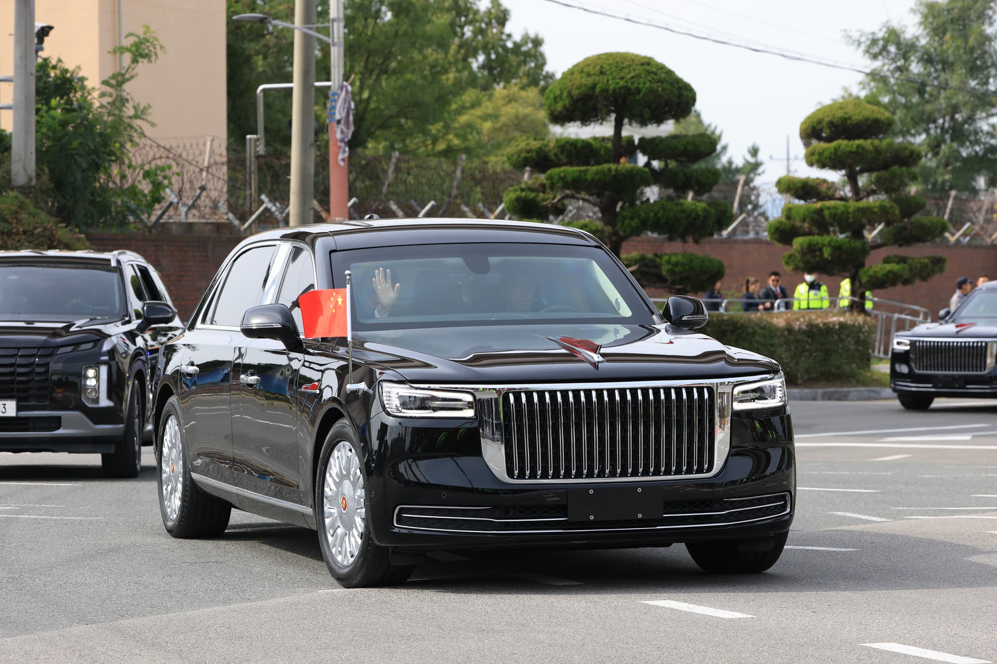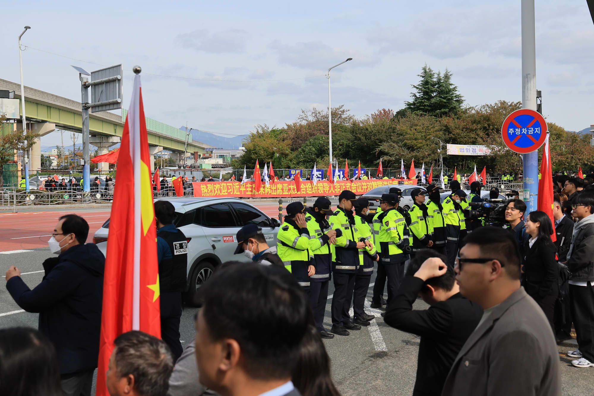 一方、中国の習近平国家主席はトランプ大統領との会談後、APEC首脳会議に出席するため車列で慶州へ移動した。基地前の歩道は習近平主席を歓迎しようと多数の中国人らで溢れ返っており、歩道を通行するのもやっとの人だかりであった。横断幕を道路の両側に設置したり、大きな中国国旗や韓国国旗を振るなどして車列の通過を待っていた。