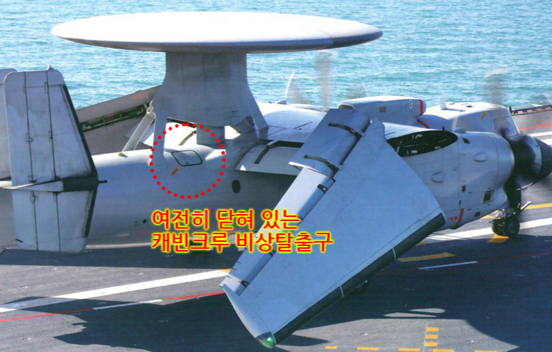 우선, 미 해군 E-2D를 모방한 KJ-600 조기경보기에선 조기경보·전투기 지휘를 담당하는 관제사석 비상 탈출구가 닫혀 있는 장면이 포착되었습니다.