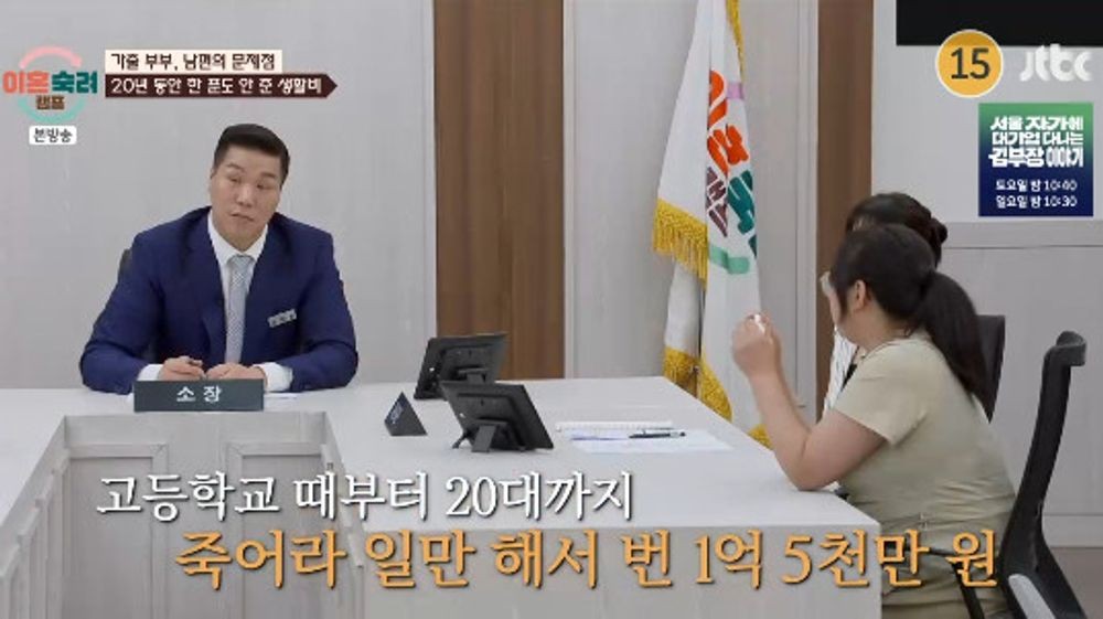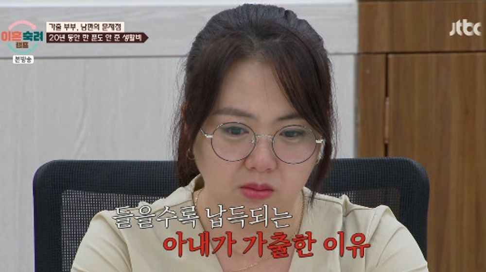 이외에도 아내는 남편이 결혼생활 20년간 생활비를 한 푼도 안 보태지 않았다고 말해 충격을 자아냈다. 아내는 “남편에게 생활비를 한 번도 받아본 적이 없다”라고 말했고 남편은 “방황을 많이 해서 일을 쉬는 기간이 길었다. 1년 일하고 6개월의 휴식기를 반복했다”라고 털어놨다. 아내는 연례행사처럼 쉬는 남편 때문에 아이들을 키우기 위해 쉼 없이 일하며 열심히 살았다고 밝혔다. “지금은 일 하시나?”라는 질문에 남편은 “이거 끝나고 바로 취직할 예정이다”라고 말해 스튜디오를 당황시켰다. 남편은 “직장 다닐 때도 생활비를 주진 않았다. 아내도 벌고 있었으니까”라고 말했다. 이에 서장훈은 “생활비 안 줘, 맨날 때려, 집안일도 안 해, 나 같아도 집에서 나갈 것 같다. 시어머니 봉양까지, 안 나가면 이상하다”라고 아내의 입장을 대변했다.