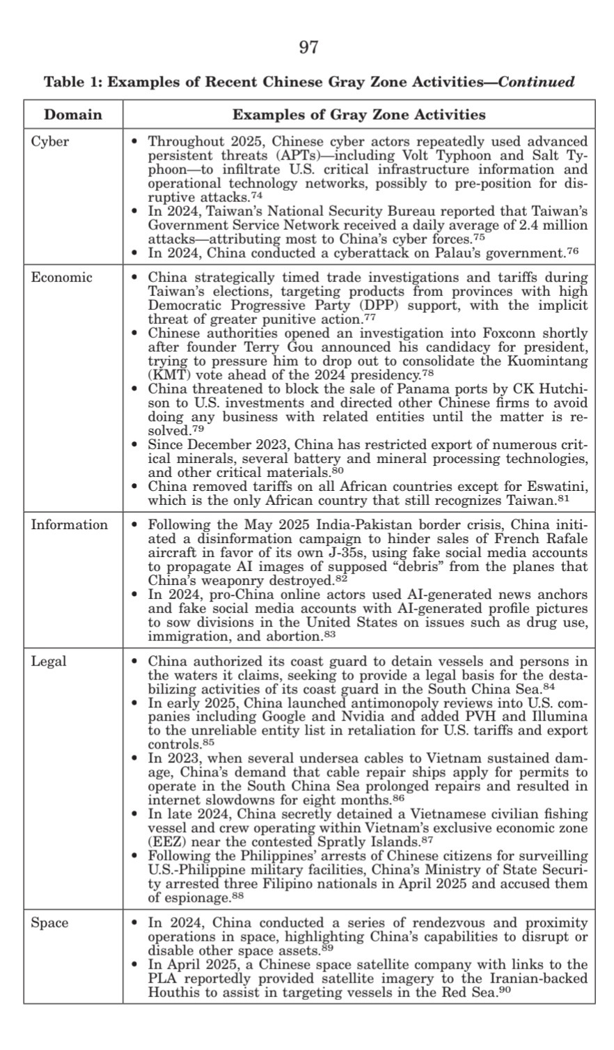 (U.S.-China Economic and Security Review Commission)가 의회에 제출한 2025년 보고서에 따르면, 중국의 ‘그레이존(Gray Zone) 활동’은 군사·경제·정보·법률·우주 분야를 아우르며 다각도로 이루어지고 있습니다.