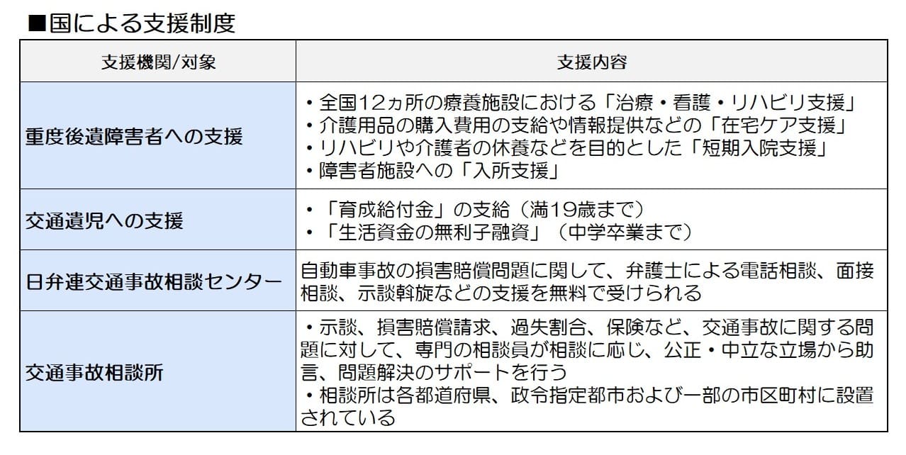 国では、交通事故で脳に損傷を負い重度の後遺障害が残った被害者や交通事故で親を亡くした交通遺児に対する支援制度、交通事故に関する無料の相談支援制度などを設けている。状況に応じてこれらの支援制度も活用したい。