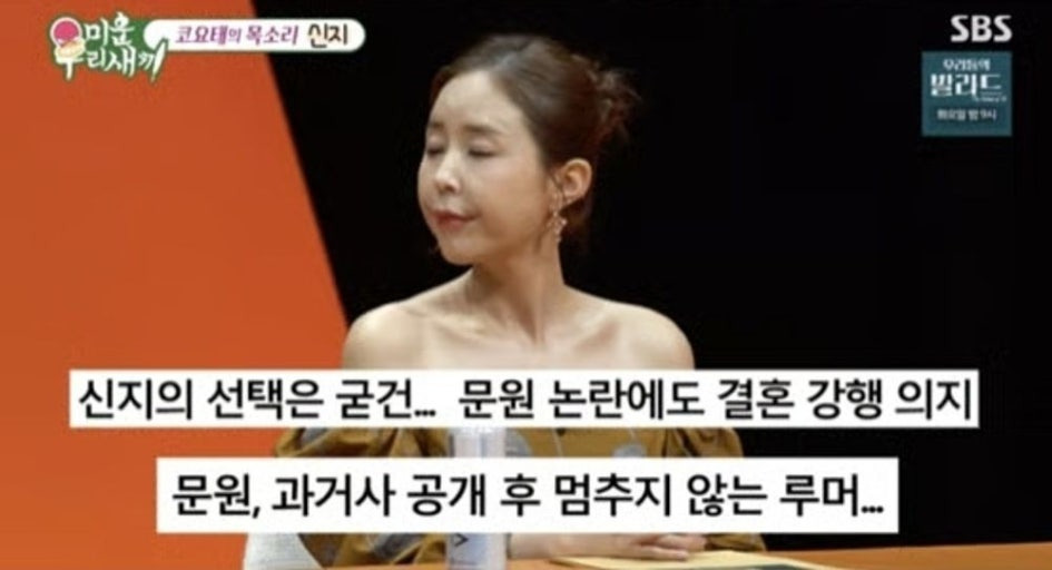 서장훈은 7살 연하인 가수 문원과 결혼 준비 중인 근황을 전했습니다. 결혼을 강행하며 의지를 보여왔던 신지에게 서장훈은 조심스럽게 “하지만 결혼 발표 후 마음고생 많이하지 않았나”며 물었습니다. 당시 코요테 멤버들과의 상견례 태도가 문제가 됐던 것과 심지어 코요테 신지를 몰랐다고 한 발언은 화제가 됐습니다.