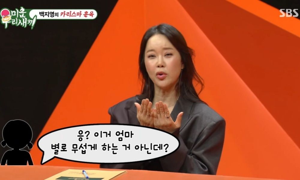 신동엽이 “딸이 혼내면 울지 않냐”고 하자 백지영은 “울면 더 혼난다. 혼나고 나서 우는 건 괜찮은데 혼날 때 눈물을 무기로 쓰면 안 된다”고 밝혀 감탄을 자아냈다. 신동엽은 백지영이 “애들이 막 소리 지르며 떼써도 안 혼냈냐”고 역질문하자 “엄마가 너무 무서워서 제가 낄 자리가 없었다”고 해 패널들을 폭소케 했다.