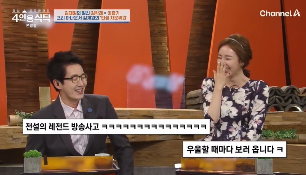 그런 가운데 박경림은 “이 짤 때문에 보기 시작했다”라며 녹화 도중 김재원이 앉은 의자가 계속 내려가는 영상을 보여주었다. 박경림이 “생방송이라 식은땀이 엄청났을 것 같다”라고 하자 김재원은 “다음 프로그램이 뉴스라 시간을 정확히 지켜야 했다. 마음 놓고 웃을 수 없는 상황이라 겉으론 웃고 있지만, 웃음 참느라 허벅지를 꼬집고 있었다”라고 토로했다.
