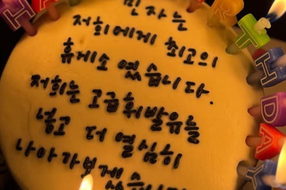 사진 속 송혜교는 스트라이프 무늬의 두건을 두른 채 케이크를 들고 귀여운 포즈를 취하고 있다. 여전한 동안 미모를 자랑하는 그의 모습이 감탄을 자아낸다. 또 다른 사진에는 “민자는 저희에게 최고의 휴게소였다. 저희는 고급 휘발유를 넣고 더 열심히 나아가보겠다”고 적힌 생일 케이크가 담겼다. 하지만 뒤이어 케이크가 바로 엎어진 모습까지 공개돼 안타까움을 자아냈다.