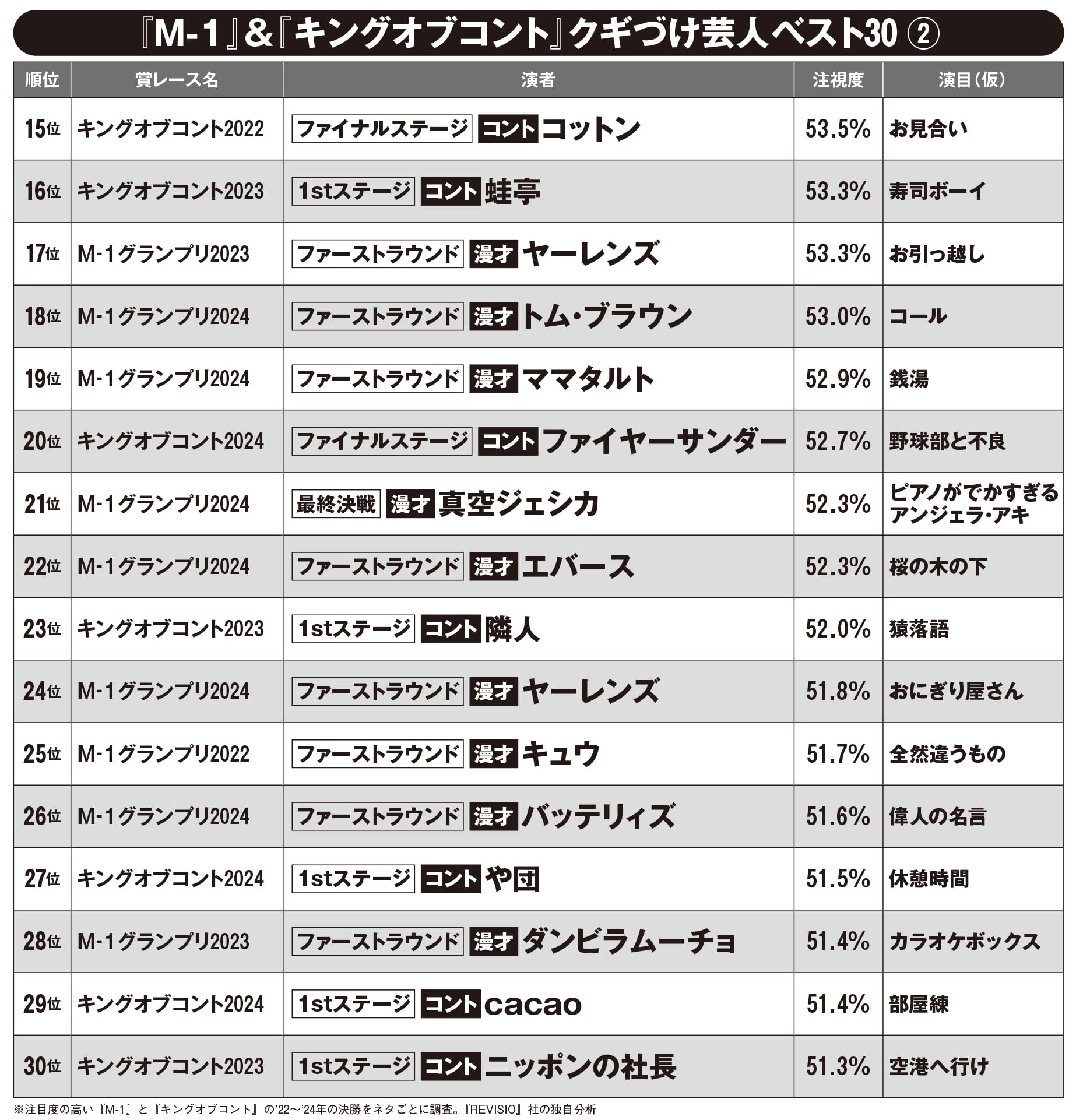 R社は番組としてのクギづけ度が高い『M-1』と『キングオブコント』に関して、ネタごとの注視度も調査している。上位30組をランキングにした(「演目」は仮)。1位は冒頭で紹介した『バッテリィズ』。2位は『M-1 2023』で、最終決戦に進出した『ヤーレンズ』だった。