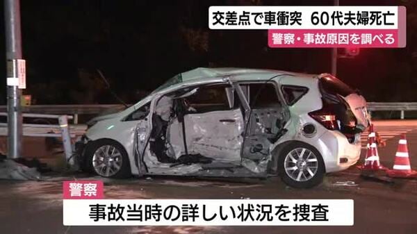 11月4日夕方、静岡県掛川市の交差点で車同士が衝突し、60代の夫婦が死亡しました。警察が当時の状況を調べています。 4日午後5時半過ぎ、掛川市南西郷の県道磐田掛川線の交差点で車同士が衝突しました。 この事故で一方の車を運転していた掛川市中の会社員の女性(62)と一緒に乗っていた夫の男性(65)が全身を打ち救急搬送されましたが、その後、死亡が確認されました。 もう一方の車を運転していた30代男性にケガはありませんでした。 事故は女性の車が右折した際に対向車線を直進する車と衝突したとみられ、警察はドライブレコーダーの映像を確認するなど当時の状況を詳しく調べています。